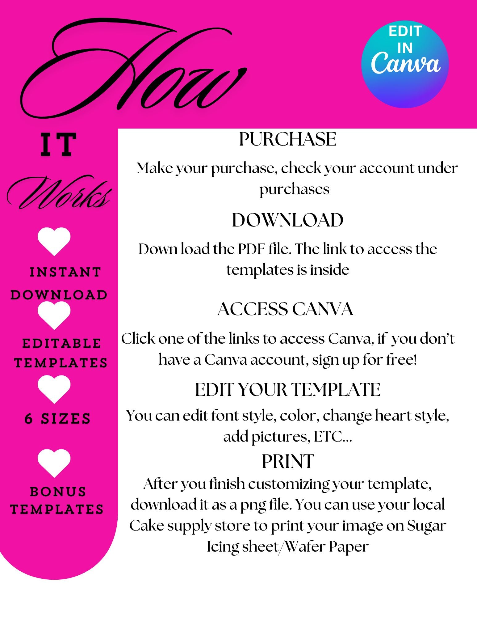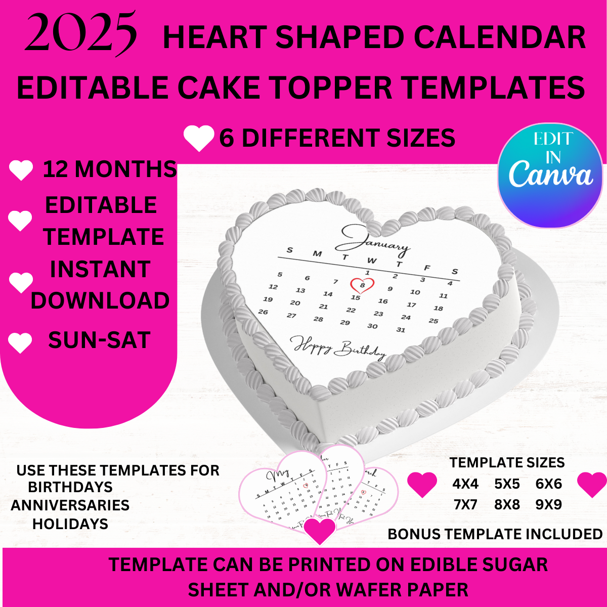 ¡Presentamos nuestras plantillas editables de calendario de corazones 2025! Estas plantillas de Canva con forma de corazón son perfectas para darle un toque especial a tus creaciones. Edítalas y personalízalas según tus necesidades. Estos se pueden imprimir en hojas de glaseado de azúcar y/o papel de oblea.