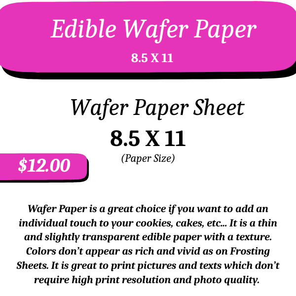 Este papel de oblea comestible de 8 x 11 está hecho de almidón de papa, que tiene excelentes cualidades para la impresión con tinta comestible y larga duración.